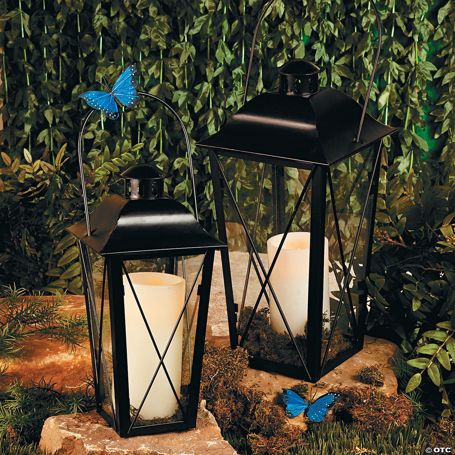 Add your own flameless candles to this pair of metal and glass lanterns to create stunning ambiance at a wedding reception or an event. They make a striking addition to a mantel, patio or tabletop display, too. Indoors or out, add these versatile black lanterns to wedding decorations or anywhere you want to create beautiful lighting. Metal and glass. (2 pcs. per set) Large, 16″; small, 12″.