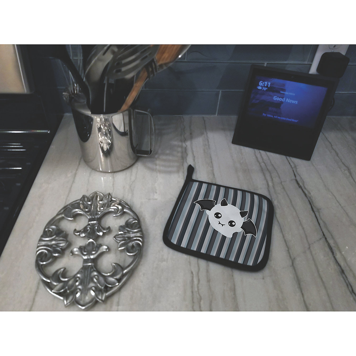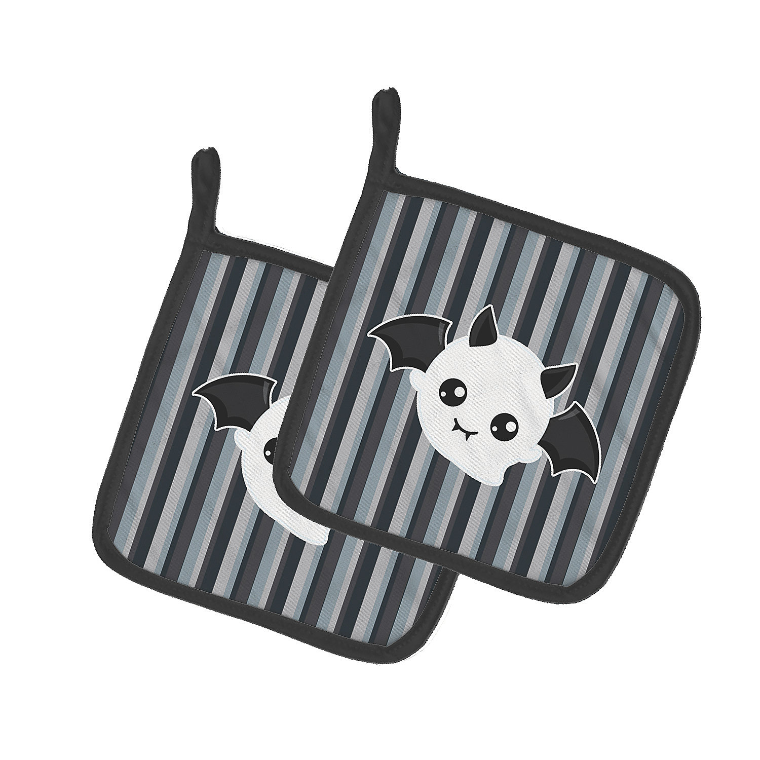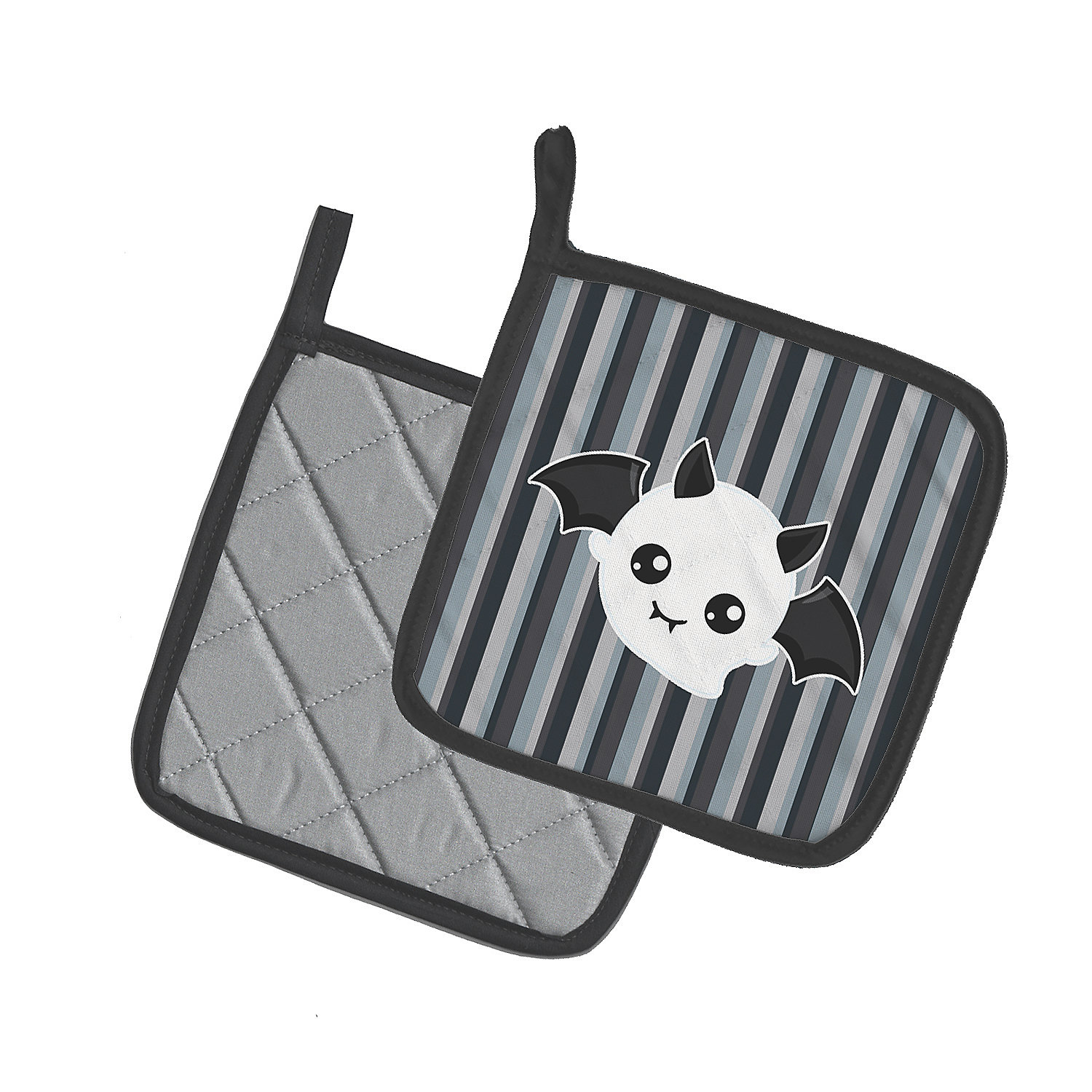 Halloween Ghost Bat Pair of Pot Holders. Celebrate Halloween with this Halloween Pair of Pot Holders. A Pair of Pot Holders to match your kitchen decor. Made in the USA these are thick and functional. Full color artwork decorates the front polyester fabric of the hot pad and accented by a black trim. Use these at as a trivet for your Thanksgiving or Christmas tablescape. Filled with insulated fabric and quilted for durability. These colorful pot holders will make a great gift for your favorite home cook or executive chef. Each pot holder measures approximately 7 1/2 inches by 7 1/2 inches. A hanging tab is included.