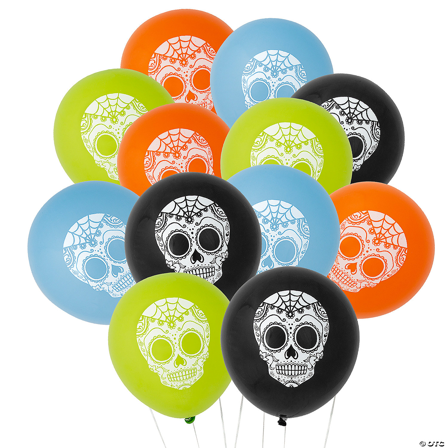 • EASY TO INFLATE: These sugar skull balloons are easy to inflate with air or helium! We recommend using helium if you plan to add them to balloon accessories (such as a weight with ribbon), so they stay afloat!• TURN IT INTO A DIY CREATIVE ACTIVITY: This package of Day of the Dead, high-quality balloons can be added to arts and crafts supplies! They’re perfect for a range of art projects and creative endeavors.• ADD BALLOON ACCESSORIES: Add visual interest to your party space; creating fun décor pieces is easy when you add balloon accessories (sold separately on this site) such as ribbon, balloon weights, balloon cups, balloon strips for garlands and more to transform them into the ultimate party decoration!• PARTY SUPERSTORE: We are your one-stop Day of the Dead party shop! Come to Oriental Trading for all of your party supply needs, from party decorations to tableware to party favors and more.Product Description:Sugar skulls are the perfect way to decorate for Dia de los Muertos, so add these Day of the Dead balloons to your party supplies. They’re bright and festive (each features a sugar skull printed in white), and they’ll make your Day of the Dead party even more memorable. Attach them to chairs around the table or to the mailbox so everyone knows where to celebrate. Size: 11″Quantity: 12Material: Latex© OTC