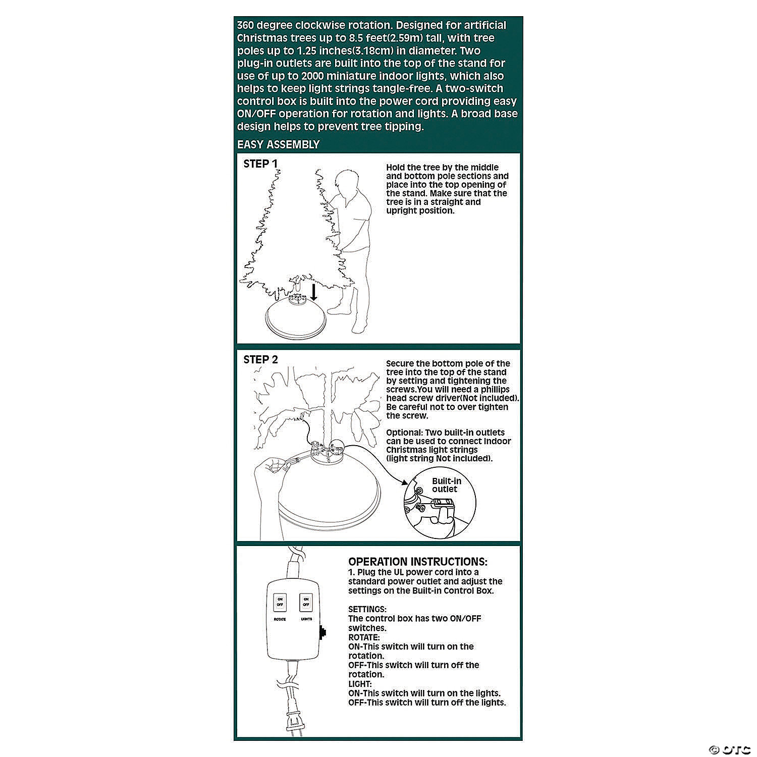 Display all of your favorite Christmas ornaments and glittering light strings with this convenient Christmas tree stand. Designed for artificial Christmas trees, it has plugs for lights built directly into the base to avoid tangling and automatically rotates 360 degrees so you can enjoy each inch of your hard work. Make your living room sparkle when you easily activate the on/off switch. A seperate switch allows you to turn off your Christmas lights. The broad and steady base prevents your tree from tipping. A holiday must-have! Suitable for tree poles up to 102″ tall and 1 1/4″ diam. Input: 110 V AC, 60 Hz. Simple assembly required.Special Shipping Information: This item ships separately from other items in your order. Imported.
