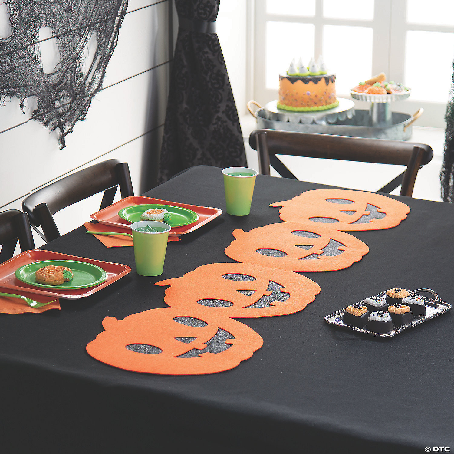 A great addition to your Halloween party décor, this pumpkin table runner features smiling jack-o’-lanterns that will light up any kids’ craft or snack table! Made of two layers of sturdy felt material, you can easily fold and store this cute Halloween decoration for re-use all season and for many years to come! Felt. 50″ x 12″ Imported.