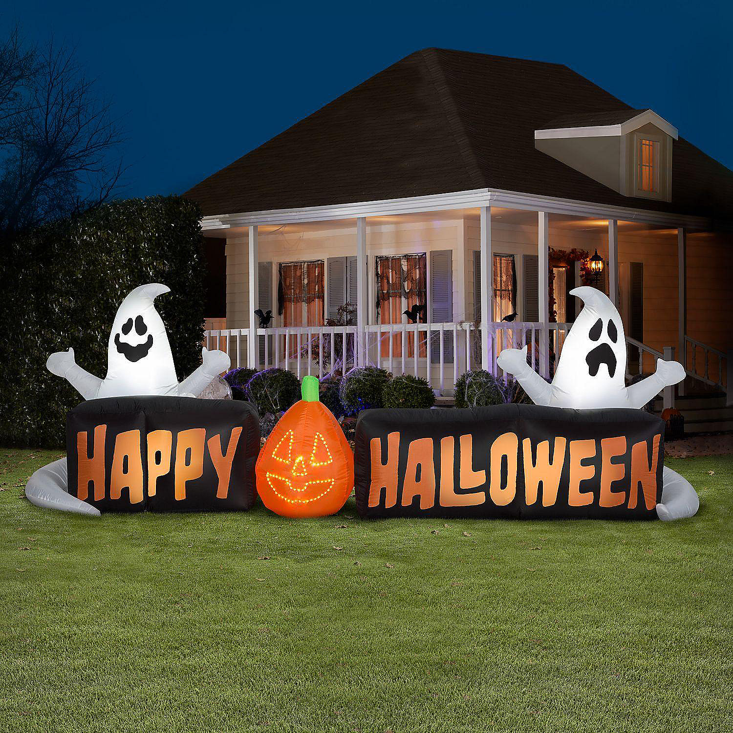 Greet your guests with this amazing Airblown® inflatable decoration. The Happy Halloween sign features a blinking pumpkin and spooky ghosts. Setup is super simple. Just plug it in, stake it down and watch the magic unfold. Display this fun decoration as a standalone or combine it with other Airblown® Inflatables to create a custom scene. Includes everything needed for easy outdoor setup.