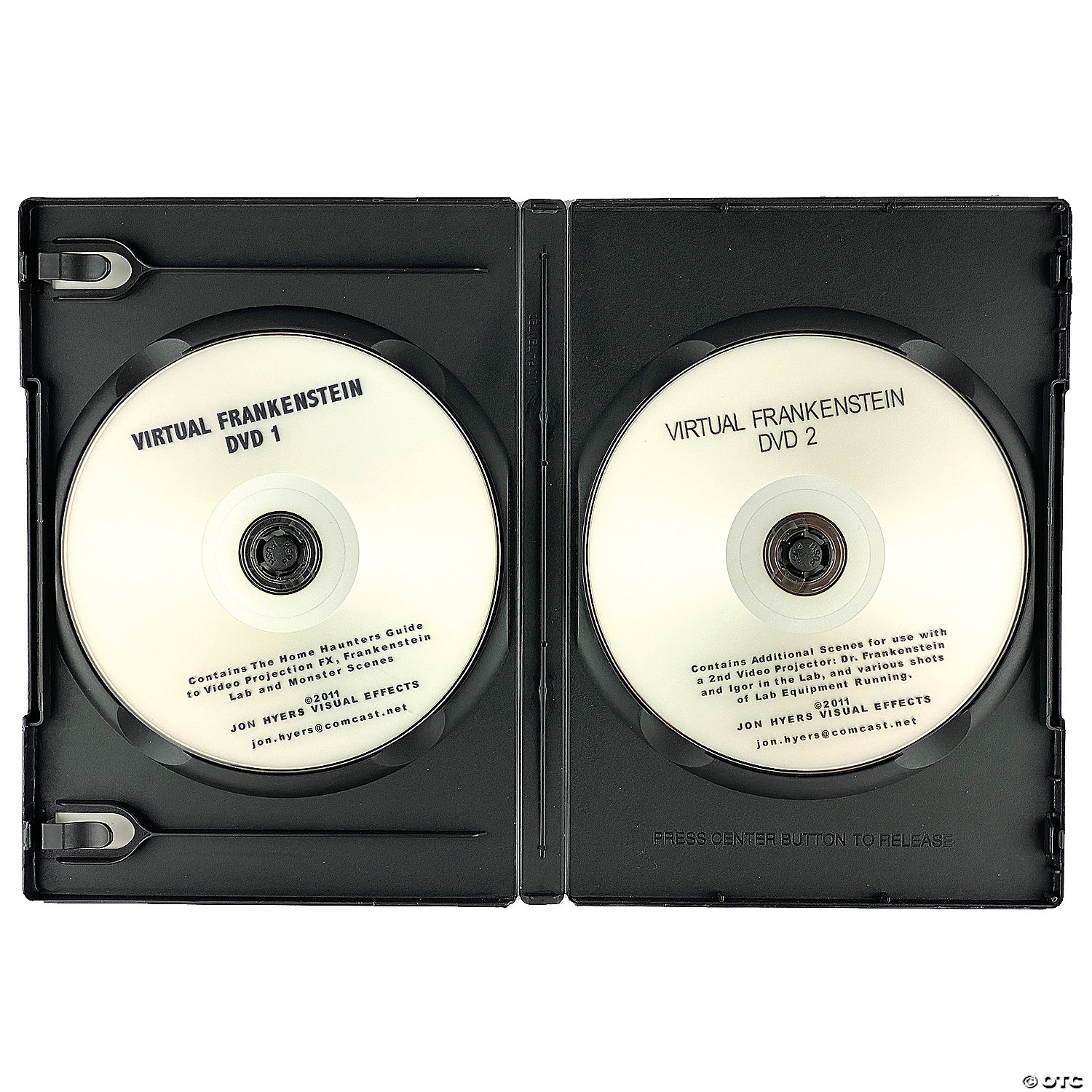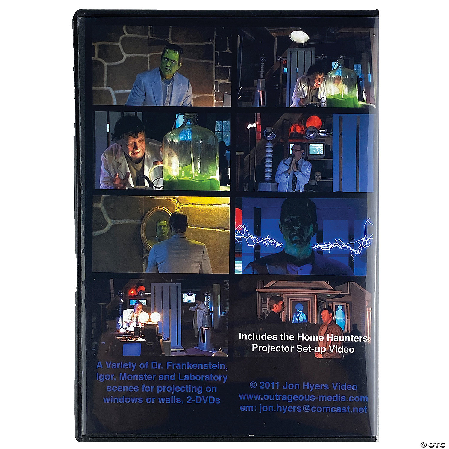 Jon Hyers DVD Projection Frankenstein DVD Set. Two DVDs for Video Projection Effects on Windows/Rear Screen and Walls. DVD 1 contains different chapters with Frankenstein coming to life, looking out a 4-Pane Glass Window, seeing his reflection in mirror, walking against a stone wall, and Waking Up to escape the lab. DVD 1 also includes The Home Haunters Guide to Video Projection FX DVD (which is also sold separately). DVD 2 contains scenes of Dr. Frankenstein and Igor working in the lab with a number of sequences, as well as close-ups of lab gear, so the user can use two video projectors to double the Frankenstein Theme of the effect/decor. Users may find that a larger TV would work for putting some of the close-up effects in a window, if a 2nd projector was not available.Special Shipping Information: This item ships separately from other items in your order. This item cannot ship to a P.O. Box. This item may be subject to additional processing days.ITEM IS NOT ELIGIBLE FOR EXPEDITED SHIPPING