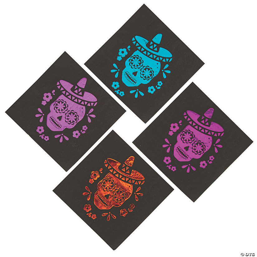 Celebrate the Day of the Dead with stylish tableware like these luncheon napkins! The black napkins are printed with reflective skulls wearing sombreros and a floral pattern frame. Stack the colorful napkins at your food buffet for guests to grab with their traditional Día de los Muertos food! Printed with foil. Paper. (16 pcs. per unit) 6 1/2″ Not microwave safe.