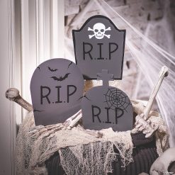 Spooky, but cute, these mini Halloween decorations are perfect for lining your sidewalk or setting up next to your patio or front porch to greet trick-or-treaters. Featuring assorted designs and phrases like “R.I.P.,” you can reuse them as part of your seasonal décor year after year. Wood. (3 pcs. per set) 6 1/2″ x 8 1/4″ with 8 1/4″ stakes. Simple assembly required.
