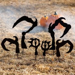 Enhance the spooky in your outdoor decorations with these metal yard stakes. When placed in your yard, this monster silhouette will appear to be rising out of the ground to scare a passersby. Give guests to your Halloween party or trick-or-treaters coming up the front walk a chilling thrill with this monster Halloween decoration. Metal. (6 pcs. per set) 4 3/4″ – 12 1/4″ x 7 1/4″ – 16″ on 6″ metal stakes. © OTC