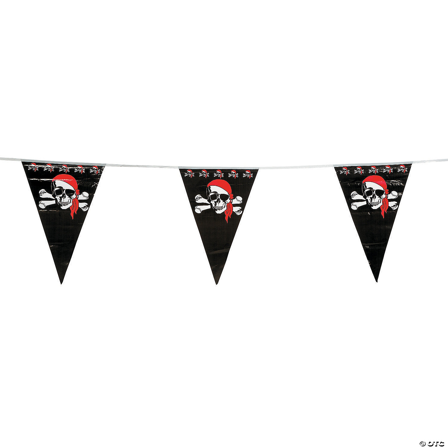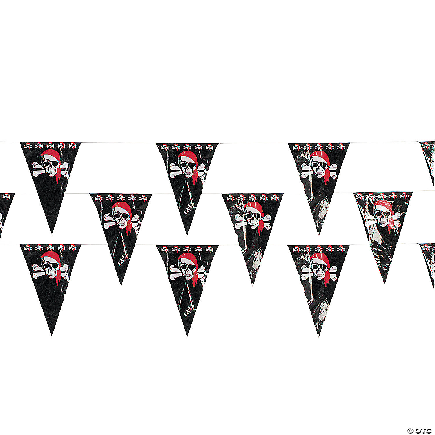 Ahoy! Decorate any pirate party with these scary skull and crossbones Pirate Pennant Banners. The perfect addition to your pirate party supplies, hang this birthday banner on any bare wall or deck railing for some added flair. This swashbuckling pennant banner includes 4 dozen 1-ft. x 18″ pennants. Make sure and find the rest of our pirate party decorations on our website to be the captain of the seven seas! Plastic. 100 ft. © OTC
